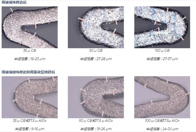 經(jīng)過吉川公司工藝工程師測試,用氧化鋁砂進行定向的噴砂處理可以去除氧化層,平滑表面缺陷并改善外圍支架的表面質(zhì)量。支架的受損區(qū)域很脆,但基礎(chǔ)材料鎳鈦諾卻具有延展性。氧化鋁噴砂磨料使用去氧化層,并且對韌性基體的侵蝕最小,從而在支架撐桿的整個長度上形成均勻的表面光潔度。 市場最新的支架設(shè)計和醫(yī)療植入物要求更大的邊緣倒圓角。圓形邊緣降低了被植入物卡住,其他風(fēng)險的可能性。氧化鋁微噴丸的半徑為5-15 m,但新的幾何尺寸指定為接近25 m。該半徑可以通過三種途徑實現(xiàn):延長噴砂周期,使用更大尺寸的氧化鋁或完全使用其他磨料。通過測試,我們了解到更長的噴砂周期可以去除更多的團塊,而較大尺寸的氧化鋁會產(chǎn)生過于粗糙而無法拋光的表面。畢竟,氧化鋁顆粒的形狀為塊狀,邊緣稍尖。這給了我們一個可行的選擇:嘗試使用其他類型的磨料。為了克服這一障礙,我們測試了幾種類型的介質(zhì),發(fā)現(xiàn)用玻璃珠噴砂可以在拐角處形成所需的半徑(最大30 m),而不會除去設(shè)備的額外質(zhì)量。結(jié)果是氧化鋁的質(zhì)量提高了十倍。經(jīng)過吉川公司工藝工程師的測試事實說明了結(jié)果的差異。用氧化鋁噴砂處理過的樣品的半徑僅為8-13 m,而用玻璃珠噴砂處理過的樣品的半徑為24-30 m。 經(jīng)過吉川公司工藝工程師最終測試事實證明,最好的心臟支架噴砂工藝需要用氧化鋁砂粗噴砂、再用玻璃珠微噴砂是目前最好的一種噴砂工藝方式。 經(jīng)過粗噴、微噴的產(chǎn)品外徑和內(nèi)徑轉(zhuǎn)角處的半徑可以實現(xiàn),而所需的附加材料去除最少。半徑的大小可以有效地控制,因為它是基于圓形磨料,玻璃珠的大小和速度的。可以控制具有附加半徑的支架區(qū)域。通過機械加工表面,有助于保持支架的疲勞壽命。玻璃珠磨料通常用于必須保持嚴(yán)格公差的噴丸處理應(yīng)用中。玻璃珠對支架表面進行噴丸處理,不會去除任何材料或數(shù)量可忽略不計的材料。如下所示,玻璃珠的尺寸很重要。玻璃珠的尺寸越大;邊緣越圓。玻璃珠有35 ,50 和100 兩種。讓我們看一下使用每種尺寸的樣本測試的結(jié)果。此處顯示的未噴砂的支架表面(500x)邊緣鋒利,并受到制造損壞。半徑范圍僅為3-8 m。為什么用兩種磨料處理比單獨用氧化鋁處理好? 玻璃珠無法消除制造過程中產(chǎn)生的浮渣,回彈和其他損壞;只有氧化鋁可以。氧化鋁不能產(chǎn)生真正的圓形邊緣。但是,它確實可以提供電拋光所需的理想表面光潔度。一個不能替代另一個。通過使用多步驟過程,植入物表面可以使用經(jīng)過驗證的相同設(shè)備獲得兩全其美的效果。在該過程中添加第二種研磨劑聽起來可能需要更多的勞動力,但實際上比其他修邊過程更有效。例如,電拋光可以產(chǎn)生較大的半徑,但它也會從整個零件中去除過多的材料,而不僅僅是角部,從而損害了支架的疲勞壽命。