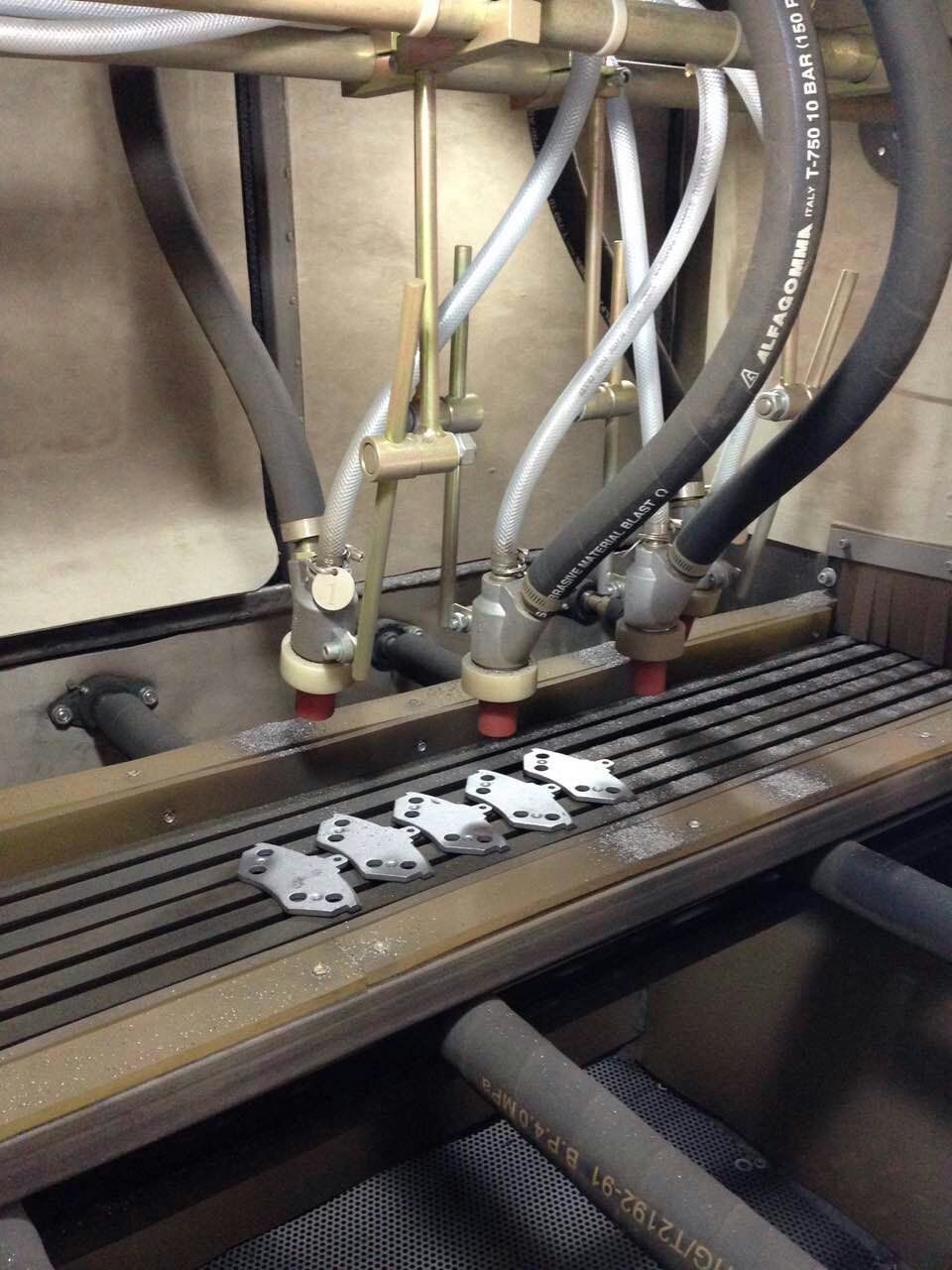 剎車片的生產(chǎn)過程中質(zhì)量尤為關(guān)鍵,其中最重要的一個生產(chǎn)環(huán)節(jié),鐵才與剎車片雛形粘合,粘合前需要通過自動噴砂機,才能有效的粘合。